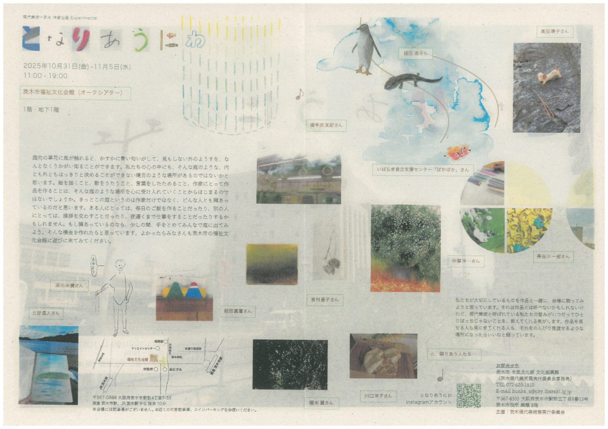 庭先の草花に風が触れると、かすかに青い匂いがして、見もしない外のようすを、なんとなくうかがい知ることができます。私たちの心の中にも、そんな庭のような、内とも外ともはっきりと決めることができない境目のような場所があるのではないかと思います。絵を描くこと、歌をうたうこと、言葉をしたためること、作家にとって作品を作ることは、そんな庭のような場所を心に受け入れていくことからはじまるのではないでしょうか。きっとこの庭というのは作家だけではなく、どんな人とも隣あっているのだと思います。ある人にとっては、毎日のご飯を作ることだったり、別の人にとっては、挨拶を交わすことだったり、夜遅くまで仕事をすることだったりするかもしれません。もし隣あっているのなら、少しの間、手をとめてみんなで庭に出てみよう。そんな機会を作れたらと思っています。よかったらみなさんも茨木市の福祉文化会館に遊びに来てみてください。